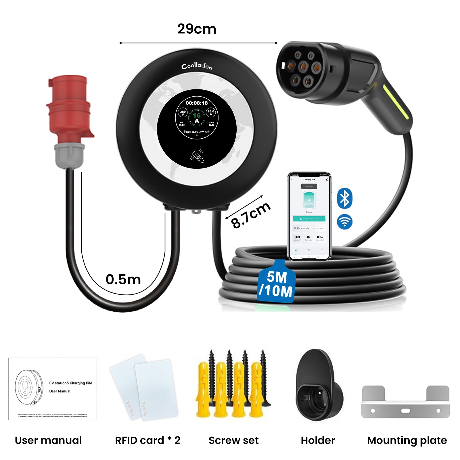 📦 Čo je v balení: 1x Wallbox, 2x RFID zabezpečovacie karty, montážna sada na stenu, držiak kábla, používateľský manuál.